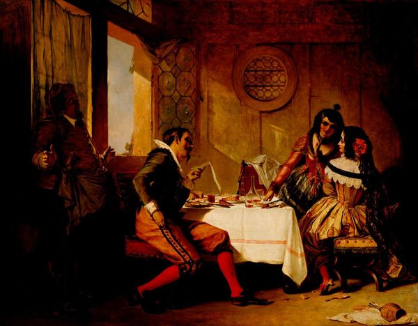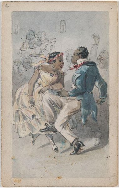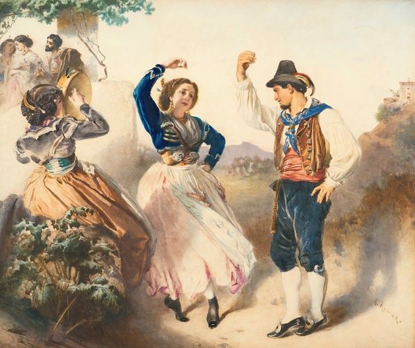 Curator: Let's consider "A carnation for the lady", a work by Filippo Indoni. Gouache seems to be the predominant medium. Editor: There’s something incredibly tactile about this piece—you can almost feel the rough texture of the fabrics, the cool smoothness of the stone wall. Curator: Observe the interplay of color and form. Indoni uses vibrant hues for the figures' clothing which contrasts subtly against the muted backdrop. The careful arrangement of these elements creates a balanced, harmonious composition. Editor: Agreed, but the materials tell more. Her ornate skirt, the boy’s roughspun vest, her woolen shawl—the painting seems very concerned with clothing and labor, each carefully considered element speaks of everyday life and local textile traditions. Curator: I'm also struck by the spatial dynamics. Note how the figures are positioned in relation to the landscape, and how it establishes depth and perspective, framing the central interaction. The gaze, the carnation itself all converge into a formal exercise of symbolic interaction. Editor: The gouache is thinly applied in areas. It gives an interesting texture to the fabrics. How much local labor did it take to create all those textiles being represented? We're also looking at consumption and display as Indoni turns a seemingly small event into art. Curator: Absolutely, it transcends simple observation to engage in a more elaborate dance of color and balance that constructs the meaning. Indoni orchestrates an event, guiding our eyes and feelings. The carnation, poised, becomes a signifier within a system, a pivotal piece of visual linguistics. Editor: Well, while it seems pretty simple, you can’t forget how important material choices can be—how the artist used gouache versus oil to represent social class through garments and context. It's the making of the image from materials up that shapes what we see. Curator: That said, the way Indoni organizes space, shape, and tone moves it beyond a documentary. Editor: And how fascinating that this little flower—so central to the composition—became more than simply what it is. Thank you.