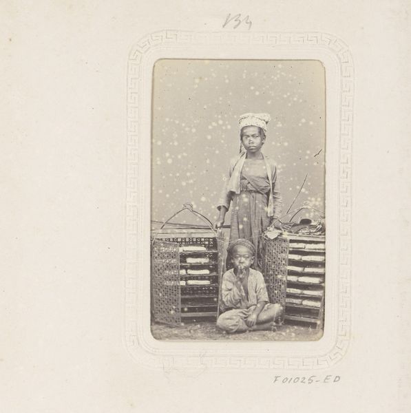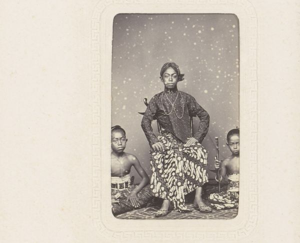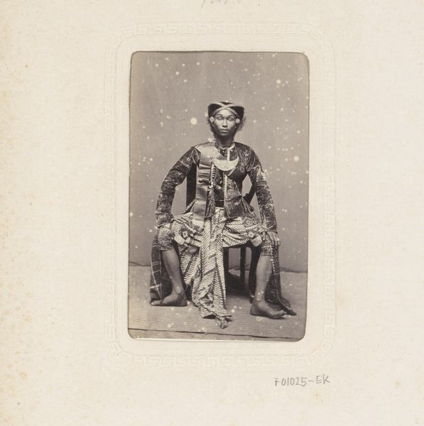 Editor: Here we have Woodbury & Page's photograph, "Portret van een zittende, Indonesische man," dating from somewhere between 1857 and 1880. I’m really struck by the materiality of this early photographic print and its rather formal presentation. What strikes you about this image? Curator: I'm interested in how this photograph operates as both a portrait and a document of colonial labor. Consider the patterned cloth the subject is wearing – likely batik. It's not simply a background detail but a product, a commodity, and a symbol of Indonesian artistry. Editor: So you’re suggesting the batik has social and economic implications here? Curator: Exactly. The means of production – the labor, the materials – all contribute to understanding the relationship between the photographers, the sitter, and the broader context of colonial trade and cultural exchange. Who produced that batik, how was it traded, and what value was placed on it? These are crucial questions when interpreting this image. Editor: That’s a good point! I had only considered it as a decorative element. Curator: The very act of photographing was itself a technological process, importing Western technology and aesthetics. The material history of the image itself – the paper, the chemicals used in processing – tells a story of industrialization and global trade. How did these photographers learn their trade, what materials did they have access to, and what impact did that have on their subject? Editor: Looking at it that way really does change how I see it! Thank you for this insight! Curator: Thinking about art through materials and their histories always deepens my understanding, and I hope it did for you too.
