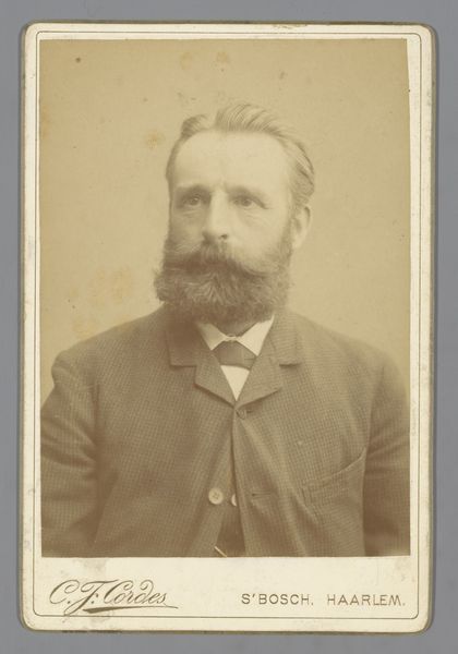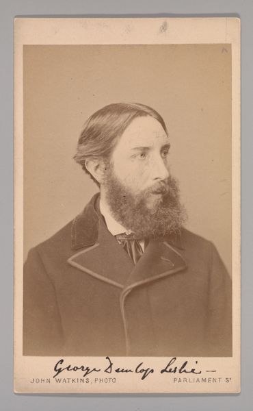 Editor: Here we have an albumen print from the 1860s by John and Charles Watkins, a portrait of William Calder Marshall. The tones are soft, almost sepia, giving it a dreamlike quality, and the texture is smooth but seems delicate. How do you read the composition and material elements of this photograph? Curator: Its power lies primarily in its formal balance and the careful modulation of light. Notice the subject’s positioning: centrally located, creating symmetry that stabilizes the composition. The tonal range, skillfully manipulated within the albumen print process, sculpts the face, emphasizing the sitter's features. Editor: The light and shadow seem to highlight his seriousness, or maybe even stoicism? Curator: Precisely. Consider how the photographers use the light to define the form of his beard, almost cloud-like, yet distinct in its texture. It becomes not merely facial hair but a compositional element that contributes to the overall aesthetic weight. Editor: So, without any historical information, we can still understand something about the image's impact based purely on how it looks? Curator: Absolutely. We can deduce relationships, create meaning from juxtapositions of light and dark, and interpret the surface itself as a carrier of intentionality. The smoothness of the print juxtaposed with the intricate detail of the beard creates a visual tension, pushing us to further contemplate its qualities. Editor: That’s a great point. I was so focused on the subject’s expression. Paying closer attention to the contrast in textures creates a richer interpretation. Curator: Indeed. The photographic print itself, its physical presence, is also important as a medium in shaping the forms and affecting our experience. It prompts us to examine how visual rhetoric creates and sustains significance in the piece.