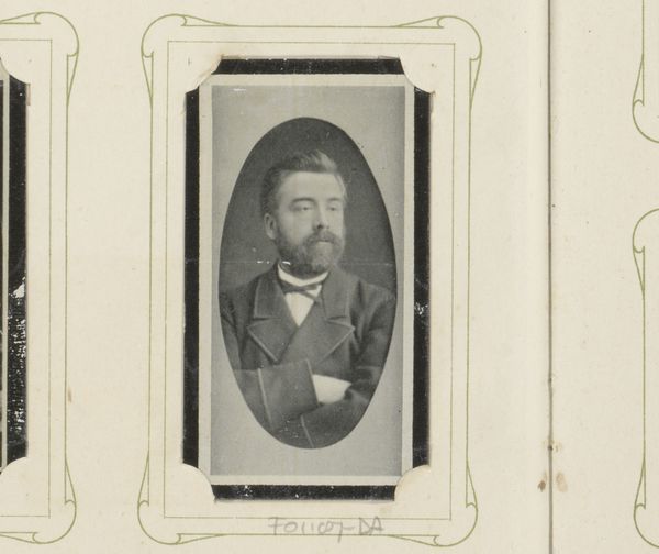 Curator: This gelatin-silver print, dating from around 1867 to 1885, presents a formal portrait titled "Portret van schilder Van Hier," currently residing here at the Rijksmuseum. The photograph captures the likeness of an unknown painter in striking detail. Editor: It's immediately the sheer physicality of the beard that captures attention, framing the man’s face. You can almost feel the texture! There's a somber feel, though – a stoicism etched in his expression. Curator: Precisely! The beard indeed holds significance. Beards, in that era, symbolized a certain artistic and intellectual stature. But note also the framing. The oval vignette concentrates the viewer's gaze, almost enshrining him. Editor: I am very interested in photography of this period; I always try to figure out the whole production that took place back then: the silver, gelatin, and glass plates themselves, and then we can't forget the chemistry of development. What’s the process of creating a gelatin-silver print reveal to us about the social context? Curator: Well, the increasing accessibility of photographic materials broadened the artistic landscape. While portraiture had been reserved for the wealthy via painting, photography offered a potentially democratizing medium. But this man chose, or perhaps was asked, to have himself captured in this fashion, suggesting an alignment with tradition while simultaneously embracing new technologies. It becomes a fascinating negotiation of identity. Editor: I wonder if the subdued tonality relates to the specific gelatin-silver process employed. Were certain chemicals favored that imparted such a sepia-like mood? The choice of materials, from my perspective, significantly contributes to the feeling. The man's jacket… one can trace its probable origin, production process, maybe even see the worker’s labor. It speaks volumes! Curator: Indeed, materiality profoundly shapes our understanding. The soft focus, common in early portrait photography, might hint at an intention, as the symbolic image that represents not only a human likeness but evokes memory, and perhaps ideals of a specific time. Editor: Looking closer I appreciate the texture of the paper – or card – it’s printed on and pasted to, again contributing to the physicality and allowing the viewer of our time to see a photograph within the material culture and production systems. Curator: Absolutely. It becomes a conversation – materials, image, and our contemporary perspective interweaving. It’s more than a historical artifact, isn’t it? Editor: It certainly is. This man, immortalized in silver and gelatin, provokes curiosity and respect across the ages. A compelling portrait indeed.