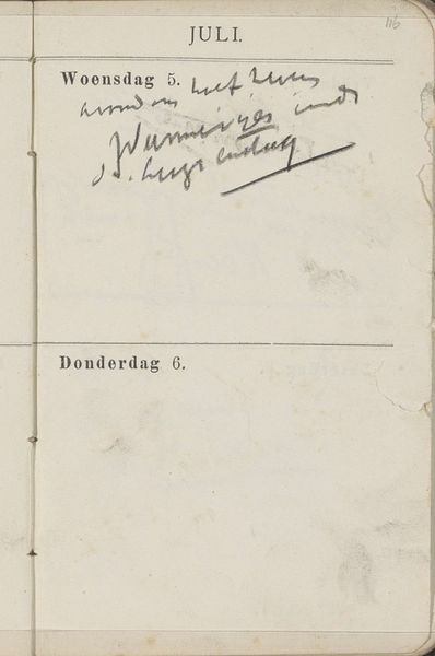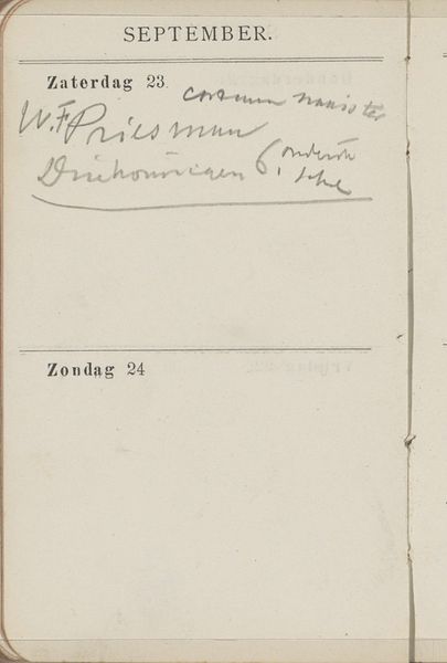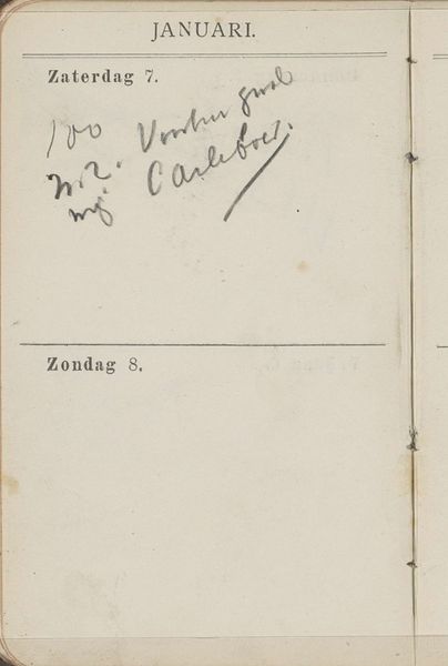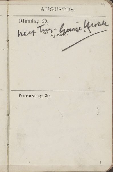 Curator: This work, "Annotaties" by George Hendrik Breitner from 1893, offers a glimpse into everyday life through the lens of impressionism, captured in ink on paper. What strikes you about it? Editor: Well, it feels incredibly personal and immediate. The script looks spontaneous and even unfinished in its form. The materiality also gives me the sense of a peek behind the scenes, a mundane scene into someone's journal and records. What do you see in it? Curator: Considering Breitner's "Annotaties" from a materialist point of view, I'm particularly interested in what this piece reveals about the social context of artistic labor. These ink markings on paper speak to the economics and routines of artistic production. It challenges the high-art status associated with paintings, focusing instead on the infrastructure – the notes, supplies, and time management – that supports creative work. Look at the printed calendar entries; November, the weekday name in Dutch. Doesn't it make you consider the societal standardization of time, labor division and payment during the Industrial Revolution? Editor: Absolutely! The calendar aspect reminds me of the relationship of creative work to production schedules, not a concept so often considered for 19th century painting. Curator: Exactly. How was paper produced? Who had access to ink and calendars? It makes me curious, does the very act of annotation – the transformation of a pre-printed page – represent an act of agency and a subversion of rigid time structures? Editor: It really opens up a whole new way to think about art – not just the finished product, but the whole process and all the related materials. Curator: It invites us to question the established hierarchy between ‘high’ art and the more mundane aspects of daily existence, offering a unique, unvarnished glimpse into the realities of making art as work. It is exciting isn't it? Editor: It is! I have never seen that angle when assessing artworks, I will consider materiality more now. Thanks so much for this chat.