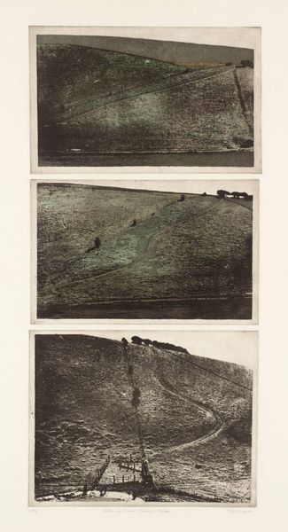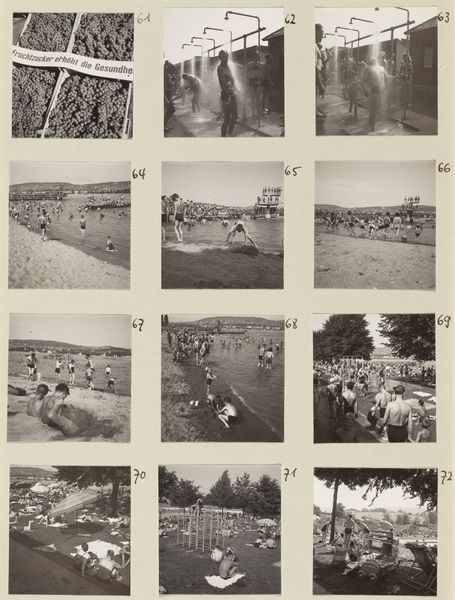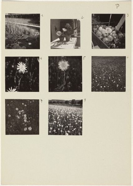 Curator: This is a piece titled "Die Landschaft (Landscape) 13-24" created between 1942 and 1946 by Robert Frank. It’s a gelatin-silver print, organized in a grid-like manner with twelve distinct photographic studies. Editor: My first impression is one of stark contrast—a kind of bleak beauty. The composition with its grid reminds me of typology, a record of variations, and something about the materiality of silver-gelatin emphasizes the gray scale, offering muted yet luminous textures. Curator: It's worth noting that Frank produced this work during and shortly after World War II, which definitely contextualizes the feeling of starkness you described. One could interpret the repeated landscape views as reflecting themes of loss, resilience, or even a quiet resistance against the turmoil of the time. It speaks of the relationship between identity, land, and place amidst sociopolitical upheaval. Editor: Right, thinking about the material conditions then, it is not so difficult to draw lines between his access to materials, like silver and gelatin for these prints, his choice to photograph nature and his access to a certain landscape – these would shape not just his practice, but the images themselves. The consistency within the series highlights how Frank, even then, was beginning to develop his unique photographic voice by creating and compiling similar gelatin prints of the same or similar motifs. Curator: Exactly. Looking through an intersectional lens, one could read it as Frank trying to define the Swiss identity against the backdrop of war and geopolitical change in Europe, given Frank’s status as a Swiss-Jewish man, one could analyze these images from a political and even personal level. The way the landscape is viewed and composed, each unique, contributes to broader issues of Swiss cultural nationalism, even though the landscapes depicted could almost anywhere. Editor: The materiality really plays into that sense of understated national identity you highlighted. These landscapes are documented with very little sentimentality – a study of the composition with almost utilitarian starkness, a deliberate approach to materiality in that the image, as material record of an action, serves as more evidence of presence, marking the intersection between Frank as a man behind the camera, but also Frank as subject and participant, capturing a cultural object, a gelatin-print. Curator: Indeed. For me, viewing Frank’s early work offers insights on not just the landscapes but broader historical and sociopolitical contexts surrounding the images – the landscape acts as witness to change, carrying layered identities and power structures within each silver particle. Editor: Yes, understanding his materials and working method allows a different understanding about his presence at the time, and a materialist approach can illuminate Frank's later work, because in them we see him actively experimenting and playing with them to explore personal or even national narratives.