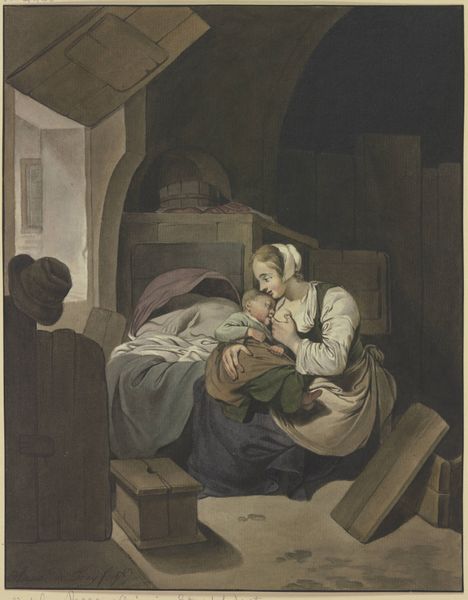 Curator: Ah, she looks utterly lost in thought, doesn't she? The angle of her face, the slight slump... It's heavy. Editor: Indeed. What we're looking at is a drawing by Abraham van Strij, created sometime between 1763 and 1826. It's called "Zittende vrouw met een koperen ketel" or "Seated woman with a copper kettle," a piece executed with watercolor, charcoal, and pencil on paper. The intimacy of it is quite affecting. Curator: Affecting and a little bleak! I mean, even the washes of color seem muted, resigned. And the kettle hanging there...almost feels like an afterthought. Editor: The placement of that kettle speaks volumes, though. The "genre painting" element points toward the material conditions of the subject, a kind of visual shorthand for labor and domestic life—elements that, then as now, significantly impacted women. The melancholy could be interpreted as resistance to those confines. Curator: Perhaps. Or maybe she's just realized she's run out of tea? No, no... you're probably right. It does have that air of… quiet defiance. She's not raging, but she's certainly not accepting. Editor: Van Strij situates her within an architectural space, pressed into the corner. It's subtle but powerful visual commentary about restricted movement, perhaps symbolic of women's roles within Dutch society at the time. Notice how the hard lines contrast with her softer, almost romanticized features? It’s quite telling. Curator: Yes, that push and pull...the sort of gritty realism meeting a hint of, well, not exactly idealization, but certainly a kind of softening gaze. Almost protective, somehow? Which feels complicated. Editor: Articulating that inherent tension, between vulnerability and constraint, is exactly what gives the work its lasting power. Curator: Well, it’s certainly given me plenty to ponder today! Thank you for that perspective. Editor: The pleasure was all mine; I invite everyone to bring their own contemplation to it as well.