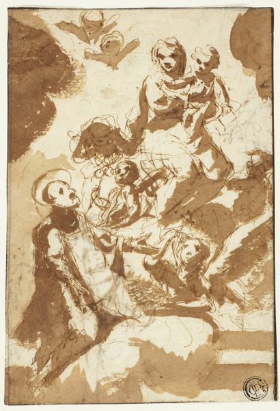 Curator: Looking at this work, my initial impression is one of chaos, of a grand struggle depicted in warm, sepia tones. Editor: This is Jacopo Zucchi’s "Jupiter Fighting the Giants," likely created between 1540 and 1596. It's a drawing, likely intended as a print, showcasing Zucchi's mastery of Mannerist style. Let's unpack that "chaos" through a historical lens. The late Renaissance was a period of enormous social and religious upheaval; do you think Zucchi taps into any of that? Curator: Absolutely. I see this through the lens of power dynamics. Jupiter's dominance, quite literally over the giants, speaks to established hierarchies—social, political, even cosmic ones. These mythological narratives provided a space for considering very real tensions present in Renaissance society, particularly regarding gendered power dynamics with male-dominated structures of society as mirrored through narratives such as this where male Gods, literally, are victorious and crushing anything, that is seen as chaotic. The "giants" might symbolize any group challenging the status quo. Editor: That's a fascinating take. What strikes me are the visual strategies involved. The dynamism, the swirling figures, they aim to express powerful and dominant entities who controlled society through all visual representation, and Jupiter had divine status and an almost propagandist visual goal within Zucchi's drawing that reflected society. Zucchi employs classical allegories, specifically focusing on the theme of history painting with figurative focus. It really underlines how this visual narrative fits within its historical setting. Curator: Yes, and if we think about the giants as perhaps representing marginalized populations— those denied a voice—the image becomes even more fraught with meaning in the context of social justice and a struggle of suppression, not only dominance in power. The warm sepia tones and printmaking medium itself evokes a sense of distance, as we try to look deeper in historical injustices. Editor: These are complex historical powerplays expressed on paper. It underscores the intersection of art and societal forces in that time period. The Met, holding a physical copy of Zucchi’s art provides an avenue to engage in the discussion. Curator: And it reminds us that even mythological scenes are deeply entwined with the real-world power structures and lived experiences of their time. Editor: A reminder indeed to examine the institutions and societal struggles reflected in visual expression through time.