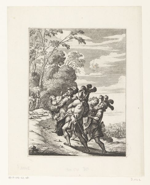 Editor: Here we have Daniel Nikolaus Chodowiecki's 1798 engraving, "Johannes Tetzel wordt nabij Leipzig overvallen en beschuldigd aflatenhandel," held at the Rijksmuseum. It depicts what looks like an ambush – rather chaotic and aggressive. I'm curious about the story behind it, especially with the suggestion of indulgences in the title. What's your take? Curator: Well, if art could talk... this engraving screams "power to the people," or at least a certain type of disgruntled Saxon! We're seeing a depiction of an actual historical event where Johannes Tetzel, the poor soul being accosted, was robbed. The title tells us that these indignant Saxons accused him of trafficking indulgences—selling forgiveness, essentially. It's important to remember the period, just before the Reformation. Editor: So, is the artist taking sides here, do you think? Curator: Absolutely! Chodowiecki, though working much later, uses this moment to tap into the growing unease with the Catholic Church's practices. You see the tension in the lines, the forceful gestures—it’s like a staged drama, isn’t it? Think of this as propaganda served with a side of artistic skill. Editor: Propaganda! That makes the dramatic composition really pop. All those agitated figures closing in… It's fascinating to think about art being used like that. Curator: Exactly. Makes you wonder about the artist’s own beliefs, doesn’t it? How art, even something small like an engraving, can reflect and shape the currents of history. Editor: Definitely. I’ll never look at a historical engraving the same way again! Thanks for making it all so clear.