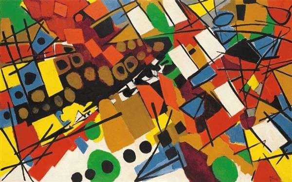 Ernst Wilhelm Nay made this woodcut print, Farbholzschnitt 1952-2, using various blocks of color, each adding its own layer to the overall composition. It's like he’s building up the image piece by piece, letting each color interact with the others in unpredictable ways. You can really see the texture of the wood in the print, which gives it a tactile quality. I love how the colors aren't perfectly aligned. In the upper right, there’s this cluster of orange and black that feels so alive. Nay was part of this post-war movement of artists exploring abstraction, and you can see how he’s pushing the boundaries of what a print can be. It reminds me a little bit of the work of the German Expressionists, like Kirchner or Heckel, but with a more playful, less angst-ridden vibe. For Nay, I think abstraction was a way of embracing possibility.