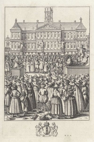 Editor: So, here we have Jacob Folkema's engraving, "Geestelijke door een dief bestolen," placing it somewhere between 1702 and 1767. It depicts a cleric in what looks like a bustling marketplace. The overwhelming feeling I get is just… activity! People milling about, commerce happening, all rendered in incredibly precise lines. What strikes you about this piece? Curator: You know, it's the everyday juxtaposed with the… ecclesiastical, shall we say, that really piques my interest. Folkema's captured the energy of a city square – think smells of produce mingling with, dare I say it, unwashed bodies! – all while this figure of the clergy becomes the… well, is he the target or just passing through? It’s the unscripted theater of it all! Notice how the lines create almost a buzzing energy, pulling our eyes everywhere. It's not about grand pronouncements, but quiet observations. Do you feel that energy too? Editor: Absolutely! It's hard to focus on any one point; your eye just darts all over the place. I'm also intrigued by the title, "Geestelijke door een dief bestolen," or "Cleric Robbed by a Thief," suggesting a narrative beyond the simple scene. But I don't *see* any obvious theft happening… Curator: Ah, the unreliability of images! That's Baroque playfulness for you. The *implication* is the hook, isn’t it? The pompous cleric – could he be blind to the pickpocket working in plain sight? Or perhaps the 'theft' is more symbolic... What do you reckon Folkema's poking at? Editor: Perhaps it's a commentary on the church's detachment from everyday life, or maybe a broader statement about hidden sin? It makes you question assumptions, I think! Curator: Precisely. And, isn’t that more satisfying than being handed the answer on a silver platter? Bravo to Folkema for sparking such internal debates. Editor: I never considered art could have this degree of narrative ambiguity! Thanks, I'll look differently from now on at baroque pieces!