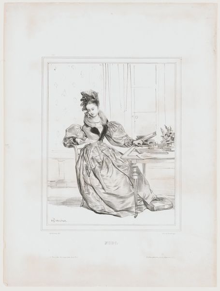 Achille Devéria created "Heures Du Matin. Mme. A. Deveria" as a lithograph, capturing a moment in the daily life of a woman, likely in the early 19th century. During this period, women’s roles were largely confined to the domestic sphere, and images like these offer a glimpse into their private lives. The detailed rendering of the woman's dress and surroundings speaks to the expectations around appearance and social standing. She is presented in a moment of quiet reflection, leaning on a chair, her posture suggesting a sense of pensiveness or perhaps weariness. Consider what it meant for a woman to be seen in such a state, neither actively performing a task nor overtly displaying beauty. Does it challenge or reinforce the era's notions of femininity and worth? Devéria’s work invites us to reflect on the complex interplay between public image and private experience, especially for women in the 1800s.