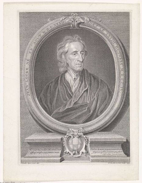 Editor: This is Michele Bisi’s portrait of John Locke. It feels incredibly formal, almost reverential. What kind of cultural memory was Bisi trying to evoke with this portrait? Curator: Look at the gaze – direct, unwavering. It’s not just a likeness; it’s an icon. Think of Locke's influence, the weight of Enlightenment ideals on governance. Does the controlled etching style amplify that sense of authority? Editor: I see what you mean. The tight lines do suggest a kind of intellectual rigor. Curator: It's as if Bisi is channeling Locke’s ideas into a visual form, cementing his place in the pantheon of thinkers. How might this image function as a symbol of reason? Editor: It's like a visual shorthand for an entire philosophical movement. I hadn't thought of it that way before. Curator: Indeed. Images carry so much more than what's immediately apparent.