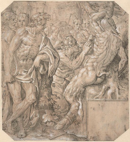 Curator: "Scourging of Christ," dating from 1500 to 1600, presents a raw and brutal depiction. What strikes you first about it? Editor: Its chaotic energy. The figures are rendered with such frenetic lines. There's a real sense of movement, almost violence, in the strokes. The men, specifically. Curator: It is quite graphic. We can locate the drawing in a very specific time—we understand the piece is currently held at the Metropolitan Museum of Art, its power lies in its brutal honesty about pain and suffering. How does this relate to today's visual culture where violence is both overexposed and often sanitized? Editor: Exactly! This feels different because the tormentors aren’t faceless, nameless aggressors. Instead, they seem possessed, contorted by something beyond just physical cruelty. There is context behind the madness portrayed that we are only briefly made privy to, as outsiders. Curator: Absolutely. The emphasis shifts from Christ's suffering to the tormentors’ active participation. What about the grid that’s faintly visible beneath the figures? Do you believe it acts only as guidance? Editor: Yes, the grid provides structure beneath all the visible emotional mayhem that's displayed in the strokes of watercolour. It's that strange tension that’s compelling here. This artistic element adds so much in this artwork, despite being so subtle. What this all means within the intersections of power, religion, and history opens multiple narratives for engagement. Curator: It offers structure amid chaos. These were preparatory aids, or perhaps this piece was part of an exploration, by an unknown artist, into ideas about judgement. This brings to mind larger socio-political considerations around institutional structures and violence—is the structure an inherent part of violence? Editor: The idea of unseen frameworks upholding systems of violence definitely resonates here. Seeing the figures almost struggling *against* that underlying order highlights that very struggle and creates an interesting contrast. Curator: It does beg significant ethical and representational questions in our current moment of reassessing historical art through contemporary theoretical and political lenses. Editor: Agreed. It’s a piece that reminds us that art, even art depicting religious scenes, is never neutral. It reflects and refracts the values and anxieties of its time and, often, of ours. Curator: Well, looking at “Scourging of Christ” has revealed both its historical context and its continued relevance in today's social and political discourse. Editor: Absolutely; it's a chilling work that stays with you, provoking uncomfortable but necessary questions.