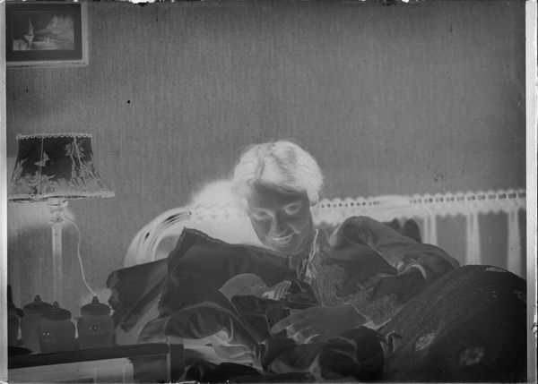 Curator: This gelatin silver print, simply titled *Untitled (Phyllis Moore Stoll, Ernest Otto Stoll, and Eugenie Stoll)* by C. Bennette Moore, presents a fascinating tableau. Editor: It has a somewhat eerie atmosphere, perhaps due to the inverted tones. The composition is rather intimate, focusing on the family gathered around what seems to be a newborn. Curator: The absence of a specific date opens up intriguing avenues for interpretation. The representation of the nuclear family during this period, its social and cultural implications, and how those power dynamics are visualized are worth considering. Editor: I agree. Structurally, the stark contrast between light and shadow emphasizes the subjects’ faces, drawing the eye to their expressions and the implied narrative of familial connection. Curator: Absolutely. The photograph prompts us to question the roles assigned within the family unit and how societal expectations influence those relationships. Editor: It’s a poignant image that prompts reflection on the intricacies of family dynamics. Curator: Indeed, its ambiguity allows for a multi-layered exploration of identity and relationships.