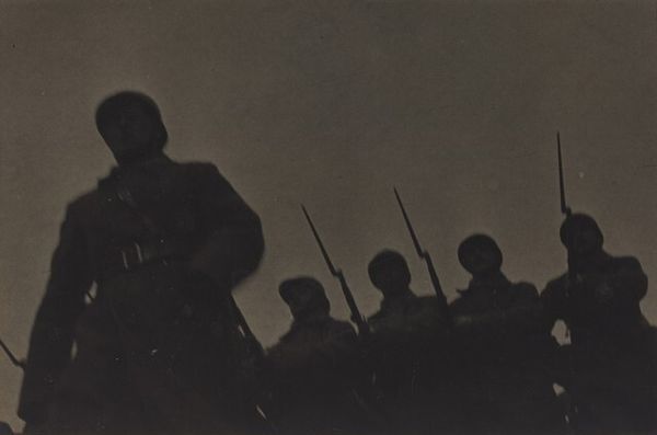 Editor: Here we have an Untitled gelatin silver print by David Levinthal, made in 1975. The black and white image seems to depict a chaotic battle scene, but there’s something… off about it. What do you see in this piece? Curator: I see echoes. This photograph, at first glance, delivers the immediate punch of conflict, that ingrained imagery of warfare, yet there's a potent undercurrent of artificiality. Do you perceive how the stark contrast renders the scene both immediate and strangely distant? Editor: I do, now that you mention it! It’s like a memory of a war movie, but grainy and staged. Curator: Precisely. It taps into our collective memory of war as constructed by cinema and photography. Consider how miniatures, almost toys, enact this profound drama. The landscape itself, shrouded in ambiguous mist, seems to recall battlefields we've only witnessed through media. It questions authenticity. Editor: So it’s not really about a specific war, but our idea of war? It's more of a symbol? Curator: Yes. Think about the enduring power of war photography and how it shapes public perception. This image utilizes those visual cues, playing on our learned emotional responses, challenging us to reflect on how our understanding of such events are constructed, mediated, perhaps even trivialized over time. What emotions are evoked in you? Editor: Initially, a vague sense of unease, maybe sadness, because of what it imitates. But then a detached feeling when I realise they’re toy figures and all becomes staged. Curator: That dissonance, that emotional push-and-pull, is central to its strength. It’s both a memorial and a critique. Editor: It really makes you question the images you see, the narratives you absorb. I appreciate how it gets to that emotional truth using toys, of all things. Curator: And that, my friend, is the captivating power of symbolic imagery.