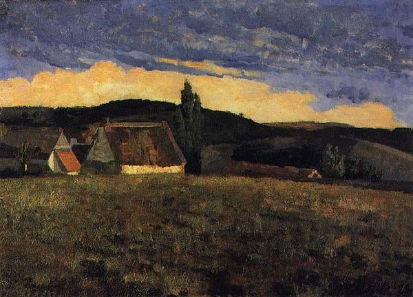 Editor: So, this is "Early Spring" by Isaac Levitan, painted in 1892, using oil paints. It feels quite melancholy, and the composition is rather simple with those humble rural structures… What do you see in this piece? Curator: Levitan masterfully captures the poignant, in-between moment of early spring. The painting is pregnant with anticipation, yet it whispers of dormancy. The thatched roofs evoke a timeless connection to the land. Notice the composition itself, how the low horizon emphasizes the vastness of the Russian landscape. What does that vastness suggest to you? Editor: Maybe a sense of solitude? It definitely evokes a strong feeling of quiet, rural life. Curator: Precisely. This stillness also suggests a cultural memory – a connection to the deep-rooted traditions of the Russian peasantry. The lingering snow, a symbol of winter's grip, is contrasted by the subtle awakening hinted at in the bare trees. These trees, almost skeletal, act as conduits, connecting earth and sky, hinting at both mortality and spiritual aspiration. Can you see any symbolic representation of death and rebirth? Editor: Now that you mention it, yes! The bare trees represent death and the hope that with spring they are reborn, just like nature and life in general. Curator: Levitan wasn't merely painting a landscape; he was imbuing it with a symbolic weight, resonating with themes of hope and the enduring spirit of a nation rooted in its natural environment. Editor: I hadn’t really considered the layers of symbolism, seeing the landscape as a symbol in itself that way, thank you! Curator: And thank you! Considering the cultural symbols embedded here encourages a richer dialogue with art.