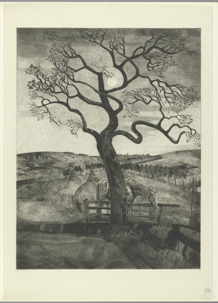 This print of a pine tree, by Reijer Stolk, is an exercise in mark-making economy. The artist has used a very basic vocabulary of lines and shapes to describe a complex natural scene. I’m really struck by the way the texture of the tree’s foliage is captured with just a few flicks of the tool. The black ink is applied in bold strokes, creating a strong contrast with the paper, and the light that rakes across the scene is represented by long lines that have a real sense of movement. There is a great interplay between the positive and negative spaces in the print, which invites the eye to move around the composition, activating the surface. Look at the thick black line of the tree trunk in contrast to the lightness of the sky, and the way the lines of the grass become more dense towards the bottom of the piece. This print reminds me of the work of Emil Nolde, another northern European artist who was really interested in capturing the mood and atmosphere of the natural world.