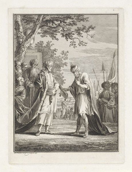 Curator: This is an engraving entitled "Germanicus Habitus, from Fashions of Different Nations" created between 1580 and 1634, and attributed to Pieter de Jode I. It is currently part of the Metropolitan Museum of Art's collection. Editor: The figures certainly strike a pose, almost theatrical in their presentation. The lines are sharp and defined, providing incredible detail and texture, especially noticeable in the clothing folds. It does feel a little…stiff? Curator: The stiffness you observe is largely inherent to the engraving technique. Each line had to be meticulously etched, meaning that flexibility in line-weight was achieved by very particular methods of cross-hatching, influencing texture. Furthermore, the composition relies on strong contrasts between light and shadow which does amplify a sense of rigidity in form, despite the evident softness achieved in rendering fabric and flesh. Editor: You’re right; look at how that contrasts with the open landscape background. Beyond the texture, I’m intrigued by the subjects and their positioning. She’s subtly touching his hand, almost restraining him from something. Who are these figures, and what stories do these details tell about gender roles or societal expectations? Curator: The title itself is a clue, and this falls within a period highly invested in representing and sometimes constructing historical figures. The print can be understood within the era’s fascination with ancient Germanic customs, reimagining figures and solidifying particular regional and even national identities through historical associations. The garments they are wearing allude to what could be viewed as historical attire, and although idealized, these were understood as markers of identity. Editor: Interesting, so they embody this constructed vision of the “Germanicus.” The contrast of refined lady with…I don't want to say 'barbarian', but there’s an implied untamed element in his beard, hat, sword – juxtaposed with his courtly attire – really encapsulates the tension. I read the Latin captions as well. “The German serves, in iron vestments." But look, he drinks too? Interesting depiction. Curator: Precisely! Through analyzing its structure, one can detect the careful considerations and historical imaginations employed during this epoch, constructing its meaning for a particular kind of viewer, and reinforcing that understanding with very subtle cues in terms of pose, gesture, and even material accoutrements. Editor: Examining the societal functions that historical portrayals carry in an image has truly altered my perspective. Curator: Indeed. It brings such a potent critical view, enabling deeper understanding.