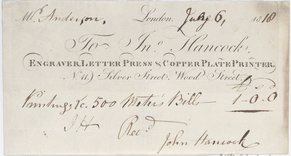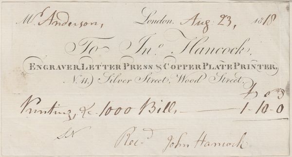 Editor: Here we have a trade card for George Fell, dating from the 1800s, an engraving combining drawing and typography, found at the Met. What strikes me is its function. It's beautiful, but it was also everyday advertising. What does this intersection of art and commerce tell us? Curator: That’s an astute observation. These trade cards, mass-produced yet finely crafted, speak volumes about the rising merchant class and their aspirations. The card’s Neoclassical style and elegant typography reflect the period’s emphasis on order and refinement, linking George Fell to notions of high culture, wouldn’t you say? Editor: Yes, the lion and unicorn feel very… elevated for something that was likely tossed around! Does this imply a kind of social climbing through printed materials? Curator: Precisely! Businesses used visual culture to assert legitimacy and attract clientele within a very competitive market. The choice of Piccadilly as a location adds another layer of understanding. What did that address communicate? Editor: A prime location equals legitimacy, perhaps even a claim to a wealthy clientele. You’re paying for paper but buying social status, too? Curator: You're beginning to see the interplay of economic forces, artistic expression, and the performance of social class. Printed matter gained influence by reaching a wide public audience. Do you consider printed material as "art" despite its commercial uses? Editor: I never thought about it that way, but definitely seeing how historical context gives "everyday objects" artistic meaning! Thanks! Curator: It all invites us to question what qualifies an object to be "art," and how definitions shift in the tides of society and history. An ordinary paper transformed into so much more!