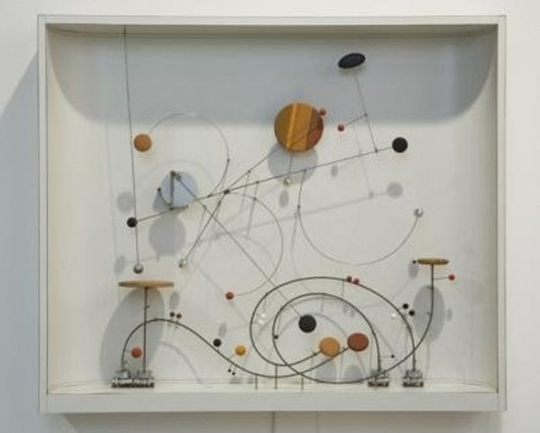 This untitled construction by Alexander Calder features floating geometric shapes suspended within a stark, circular frame. The circle, an ancient symbol of the infinite, of wholeness, immediately brings to mind the ouroboros, the snake that eats its own tail, representing cyclical existence. Throughout history, the circle has manifested in countless forms, from religious halos denoting sanctity, to the mandalas used in meditative practices. Consider Giotto's Ognissanti Madonna; the halo that surrounds her head conveys a powerful sense of divine perfection. Here, Calder subverts the circle's traditional associations. It is no longer a static symbol of completion but a dynamic frame for movement and change. The hanging shapes—spheres and cylinders of primary colours—dance in a delicate balance, suggesting the ever-shifting nature of existence. Calder taps into our collective memory of the cosmos and the subconscious desire for order within chaos, inviting us to contemplate the interplay between stability and motion. It embodies a constant state of becoming, a perpetual return to the origin, echoing the eternal cycle of life, death, and rebirth.