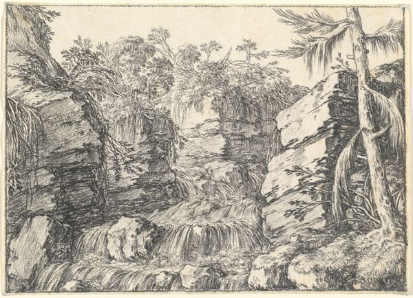 Curator: Before us, we have "Balaam and the Angel," a c. 16th-century etching and engraving by Hanns Lautensack, housed here at the Minneapolis Institute of Art. Editor: It strikes me as almost theatrical. The dark, looming rock formations, like a stage set, certainly lend a dramatic air to the encounter. Curator: Indeed. Consider the materials—the printmaking process itself. The artist, Lautensack, carefully manipulated the metal plate to create this sense of depth, through hatching and cross-hatching. This wasn't about quick, mass production but skillful labor to get it right. Editor: Absolutely. But look closer at those central figures, Balaam and the angel, locked in a confrontation within that dramatic space. The winged figure, almost radiant, halts Balaam's journey. Angels, as messengers of divine will, appearing in moments of crisis or decision. It's about revelation and turning points, isn't it? Curator: Right. And think about what's involved: acid, metal, ink, and paper. All combined through a printing press to spread ideas rapidly across Europe during the Reformation. These aren’t merely aesthetic decisions. Look at the cultural shifts in the social fabric of society that influence both production and distribution! Editor: I see it too: this tension between natural elements and something higher. Landscape with conflict. Symbolically charged landscape reflecting inner turmoil or moral crossroads. What choice will be made? Curator: That combination is exactly what provides so much complexity for a work of art seemingly made so simply, from just those humble materials. Editor: Well, whether you're focusing on the ink or on its narrative potency, it’s clearly a powerful image to grapple with from whatever viewpoint.