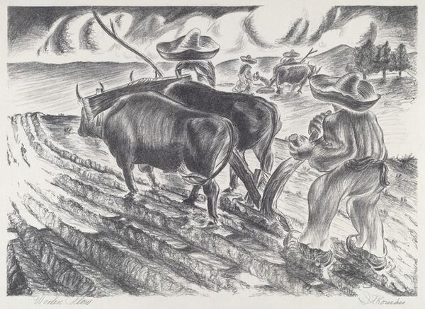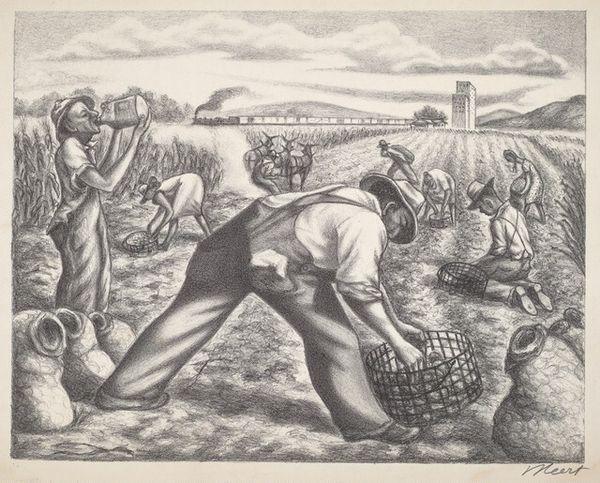 James Baare Turnbull made this print, Fifty Cents a Hundred, sometime in the 1940s. The entire scene is built from such intricate cross hatching and mark making, like a kind of feverish dedication to process. Look closely, and you can see how the figures emerge from a dense network of lines, each one carefully placed. It's all monochrome, but feels so full of texture, from the rough fabric of the workers' clothes to the heavy sacks they're filling. I'm really drawn to that diagonal road that seems to extend toward the horizon, the lines of the road giving it this dynamic perspective. It suggests not just a physical space but a journey, a passage through the landscape and perhaps through time. The way he uses these graphic elements reminds me of the prints of someone like Jacob Lawrence. I think what’s so interesting is the way the image isn’t just representational but also deeply expressive. It’s less about the specific scene and more about conveying the feeling of the scene, the labor, and the landscape, and how those things intertwine in our experience.