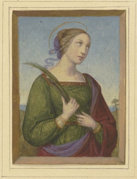 Curator: Here we have “Sibylle,” an oil painting crafted before 1807 by Johannes Emilius Phaff. Editor: Ooh, mysterious! She's caught between earthly writing and some sort of otherworldly gaze, isn’t she? The colors feel rich and dramatic. Like a backstage moment from a very intense opera. Curator: Indeed. This painting blends Romantic and historical painting styles and offers an allegorical figure: the Sibyl, a figure of female prophecy and wisdom from ancient Greek and Roman tradition. Editor: Ah, a prophet! Now it makes more sense. She's definitely got that "seeing things" look about her. I bet she has a crazy cool story—the kind that leaves you wide-eyed and whispering “no way!”. Curator: These depictions gained prominence as emblems of cultural and political identity, especially in times of national upheaval. Portraying women in classical or mythological roles allowed for exploration of civic virtues and ideals under the guise of historical allegory. Editor: That red dress! It practically screams "passion" or maybe "danger." And her turban gives me an intriguing air of foreign mystery; paired with the parchment scroll in hand, there is a visual contrast between Eastern garb and Western tradition that makes you stop and wonder what it is she's been charged to interpret from up above. Curator: The Romantic interest in the past, especially its mystical aspects, lent itself well to the revival of figures like the Sibyl. Phaff probably positioned her as both a figure of learned wisdom and feminine inspiration, and perhaps a patriotic one as well. Editor: I keep imagining her cave – the smoke, the echoing voices. You can almost smell the strange herbs burning! Okay, so maybe it’s my imagination going wild. This painting stirs up vivid scenes, the background all but dissolves in shadow. The textures are so thick in that background, you might catch yourself wondering, who’s afraid of the big bad prophecy? Curator: Ultimately, the power of artwork such as "Sibylle" lies in its engagement with complex layers of meaning that echo across different eras and interpretations. Editor: Exactly, like those old songs that feel like they’re telling your story, even centuries later. Phaff's "Sibylle" hums with secrets; she holds your gaze as you feel time beginning to bend...