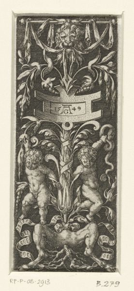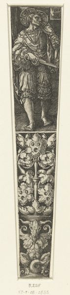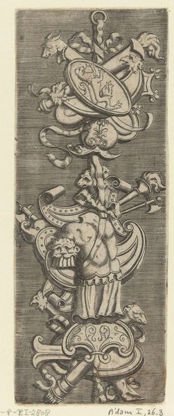 This print, whose maker is now unknown, pictures a long, narrow ornament incorporating a trophy with shield. Prints like this one circulated widely in the early modern period, and they acted as a kind of visual database for artists and artisans. By the sixteenth and seventeenth centuries, printmaking had grown into a powerful industry, centered in cities like Antwerp and Amsterdam, and the ready availability of images played a crucial role in standardizing the visual languages of European art. Prints like this could be used by sculptors in search of ways to decorate a triumphal arch, or a silversmith looking for inspiration in the design of heraldic ornament. The circulation of prints was an early form of visual globalization, and it depended on complex economic and institutional structures, from international trade fairs to copyright laws. To learn more, scholars consult inventories of print shops, guild records, and the collections of ornament prints in museums.