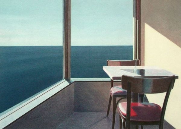 Editor: Here we have John Register’s “Restaurant,” created in 1990, an etching showing a figure alone in a restaurant setting. I’m immediately struck by the contrast between the dark interior space and the bright, open view outside. What formal elements stand out to you? Curator: Formally, the work is dominated by a play of orthogonal lines, isn't it? Notice how the vertical supports of the restaurant's structure compete with the horizon line outside. The high degree of contrast enhances the sense of depth and spatial tension, drawing our eye through layers of form. What’s more, the repeated rectangles of the tables, windows and the implied picture frame created a highly structured surface that demands decoding. Editor: The repetition of geometric forms, certainly creates a visual rhythm. But I'm also thinking about how that lone figure factors into the composition. Would you say its placement is intentional, furthering a message? Curator: Undoubtedly. Its location almost perfectly bisects the picture plane, setting up a division that must be reconciled by the viewer. If the subject were instead, centered, how would it affect your understanding? Editor: I imagine that a centrally placed figure would disrupt the balance in a dynamic sense. But that raises the question, isn’t the perspective odd? Are the interior angles of the space somewhat distorted? Curator: The rendering is indeed unusual, it creates spatial ambiguity and subtly undermines the structural integrity, further highlighting its formalist underpinnings. This tension forces us to consider it as an assemblage of signs, a formal puzzle that only yields meaning once deciphered. Ultimately the figure itself seems to be a signifier. Editor: So by focusing on form rather than a narrative we begin to see how carefully constructed the piece actually is. Thank you for this amazing insight! Curator: It was a delight; considering these visual components allows for an understanding that might have been otherwise unobtainable!