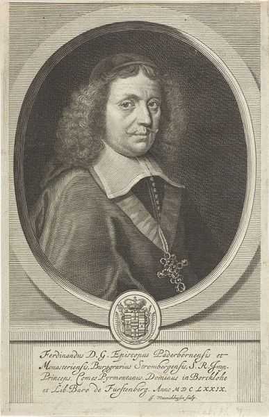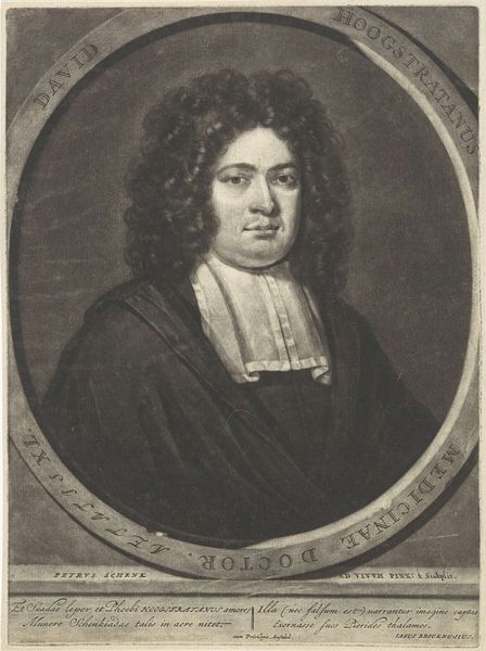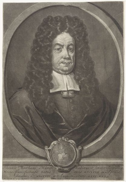 Jacob Gole created this portrait of Conradus Mel using engraving techniques. The composition is immediately striking for its oval frame, filled with symbolic emblems and text, which encircles the somber figure of Mel. Gole's use of line is meticulous, creating depth and texture, particularly in the rendering of Mel’s hair and clothing. The contrast between light and shadow, achieved through fine, precise lines, gives the portrait a sense of volume. This formal approach is interesting when we consider the cultural context; the emblems include a skull, an ouroboros and an hourglass suggesting themes of mortality, cyclicality and time. The engraving destabilizes the traditional portrait by embedding the subject within a network of symbols and text. This is not merely a likeness, but an intellectual puzzle, challenging the viewer to decode the sitter’s identity through visual and textual clues. The engraving becomes a site of semiotic play, disrupting fixed meanings and inviting multiple interpretations.