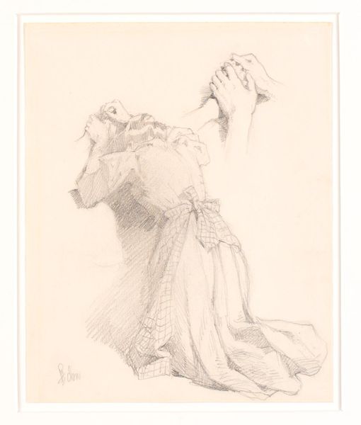 Curator: This watercolor drawing, "At the Mont de Piété", was created by Paul Gavarni around 1850. Editor: It's a somber image. The colors are muted, almost drained. It speaks of poverty and hardship, the woman seems weary, almost defeated. Curator: "Mont de Piété" translates to "mountain of piety," but it was actually the French term for a pawnshop, usually run by charitable organizations as a social service providing small loans at modest interest. Editor: Ah, now that gives her weary pose context. The bag in her hand, it isn’t heavy with treasures, but most likely her last meager possession to hock for money. The gesture reads universal, a visual language of distress recognizable across cultures and time. Curator: Precisely. Gavarni was known for his depictions of Parisian life, often focusing on the working class and marginalized figures. His art provides a lens into the social realities of his time, portraying individuals often overlooked in grand historical narratives. The piece invites consideration about the role of social welfare and the experience of poverty. Editor: Even the colours mirror that melancholy. Brown and dull violet create an atmosphere of dust, perhaps evoking a wider cultural narrative of disenfranchisement. What might the bonnet she’s wearing signify, beyond mere fashion? Curator: Bonnets at the time signified various social classes or circumstances. While I cannot infer definitively, its simple style in conjunction with her posture may infer working-class status, highlighting societal hierarchies and class disparities of 19th century Parisian life. Gavarni also captured a shifting urban landscape amid rapid industrialization, and images like this reveal that progress wasn't necessarily benefiting all. Editor: It reminds us of the power of empathy and representation. Looking at a seemingly simple artwork allows us to consider a complex history. It’s a story told without words. Curator: Indeed, art often serves as a silent witness to human experiences that shape our understanding of past and present.