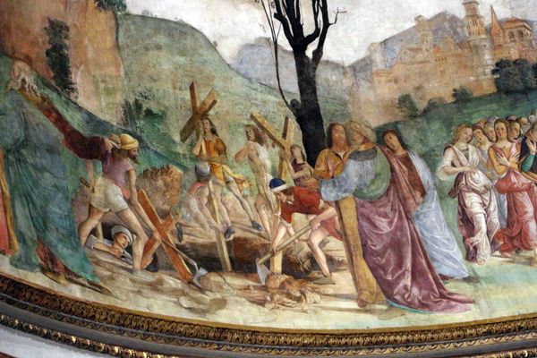 Editor: Here we have what seems to be an oil painting by Antoniazzo Romano called 'San Girolamo che cura il leone'. The damage to the painting almost makes the right half of the scene ghostly, yet it makes me wonder how such paintings were made, where the raw materials come from... What can we really say about this piece? Curator: The focus on the 'making' is key here. Let's consider the tempera and oil paints: Where did Romano and his workshop source their pigments? Were they local, highlighting regional trade networks? Or imported, reflecting broader economic ties? The very materiality of the artwork embeds it in a web of social and economic relations. Editor: I hadn't thought of it that way before! So the red in the robes, or the gold in the frame—their value wasn't just aesthetic. Curator: Precisely. And it extends beyond the pigments themselves. Who prepared the panel? How many apprentices were involved in the production? The 'San Girolamo' isn't just a devotional image, it's a record of skilled labor, of workshop practices and the artist’s means of production. Consider the lion—was the depiction based on firsthand observation, or existing illustrations? That alone reveals much about artistic practice at the time. Editor: I guess seeing the art this way reveals the world of labor surrounding it, not just art. Curator: Exactly! We need to look at the materials and techniques, they are always products of their time and speak volumes about the values, opportunities, and constraints of the society that produced them. Editor: I’m starting to think differently about Renaissance art, about everything it communicates, that's fascinating. Curator: Indeed. By looking at the materials and production processes, we can appreciate that materiality provides rich insights and challenge assumptions about artistic creation.