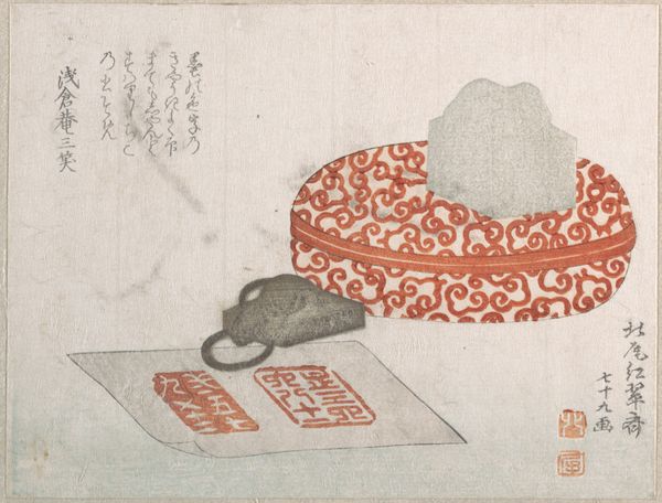 These Pocket-Books were made in Japan by Kubo Shunman using woodblock printing. The composition is deceptively simple. What appears at first glance to be a casually arranged still life is actually the product of a highly disciplined process. Each color you see was carefully carved into a separate block of wood. The printer then applies ink and presses it onto the paper in precise registration. The texture of the wood grain remains subtly visible, particularly on the ochre colored wallet. This is a tell-tale sign of the technique used. The very slight misalignments between the colors, known as ‘slippage’ in printing, also gives the image its appealing handmade quality. Woodblock printing was a commercial process in Japan, used for everything from advertising flyers to high-end art prints. What sets this work apart is Shunman’s sensitivity and attention to detail, raising the status of printmaking closer to that of painting. By celebrating this blend of art and craft, we are invited to see both in a new light.