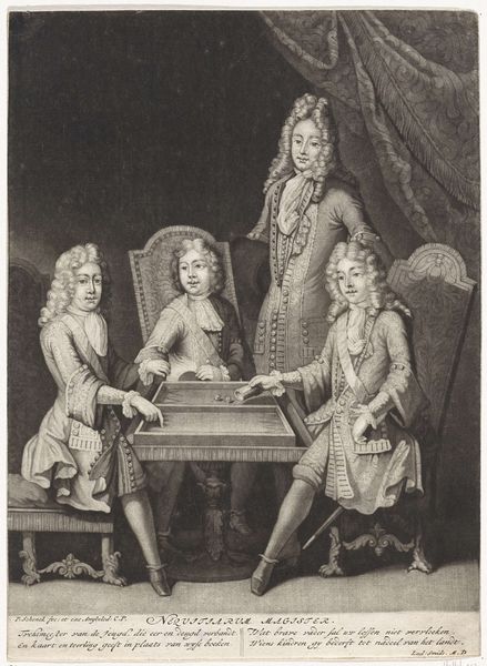 This is Jacob Gole's "Het Gehoor", a monochrome engraving likely made around the late 17th or early 18th century. The composition features two figures, one with a lute, the other with a harp, positioned within a structured domestic setting. The contrasting textures, created through varied line work, draw the eye across the image, inviting a sensory experience. Gole uses structured forms to explore themes of harmony, balance, and sensory perception. The composition functions as a semiotic system. The musical instruments represent the harmony between the senses and intellect. The figures’ placement and interaction, constructed from lines and forms, invite us to consider the interplay between performance and audience, self and other. Consider how the structured design of the print functions as a cultural artifact reflecting artistic conventions of the time and the social context in which it was made. The artwork challenges us to examine how we understand the relationship between art, sensory experience, and social interaction.