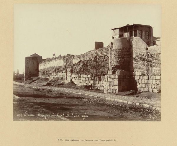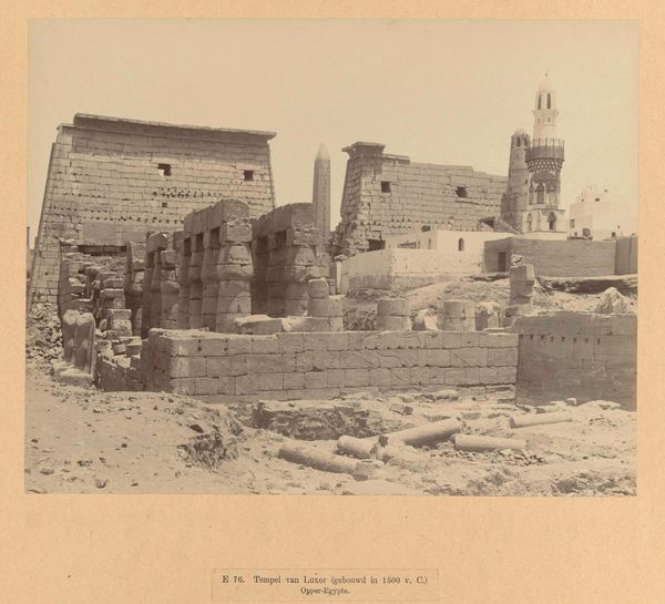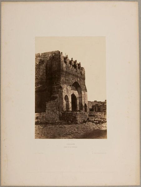 Curator: The sheer size! It's a behemoth of stone, a fortress silently enduring. You can almost taste the dust and the echoes of centuries just looking at this image. Editor: Exactly, it's an albumen print entitled “Boog van Robinson, Jeruzalem” by Félix Bonfils, dating to sometime between 1867 and 1877. Bonfils was quite the entrepreneur, setting up a commercial photography studio in Beirut. His work reveals so much about photographic materials and Orientalism’s impact at the time. Curator: Entrepreneur, yes, but he captured something melancholic here, I feel. It’s this stillness; those archways almost seem to be holding their breath. I imagine light, blazing and inescapable—Bonfils distilled it into something quiet. It's hard to imagine the daily struggles within these stone walls. Editor: Well, and that silence you describe stems, in part, from Bonfils's chosen method, right? An albumen print on paper involves coating the paper in egg whites! A fairly intense practice if you think about production: procuring eggs, separating whites, coating, exposing…The final image becomes intertwined with the realities of labor. Curator: That's a beautiful thought! Everyday life, bottled into an image like some long-lost genie. When you notice the graveyard leading up to the structure, there’s this real merging of the eternal and temporal. He framed our inevitable end with incredible precision, really. Editor: Precision definitely came at the price of considerable work behind the camera! We mustn’t overlook the chemical processes at play, all reliant on colonial trade networks that allowed such visual records to become widely consumed. Those sepia tones hint at layers beyond a picturesque shot. Curator: Indeed, it feels heavy, grounded by both intention and material. I think it captures history but hints, as any photograph does, about a truth slightly beyond what is depicted, a truth it can never reveal. Editor: It prompts a look back, absolutely. As a medium, photography, as it’s practiced, carries its social fingerprints, literally imprinted in its emulsion. Bonfils' Jerusalem is at once an aesthetic and documentary treasure but always reminding us about its constructed nature through the materials that make it.