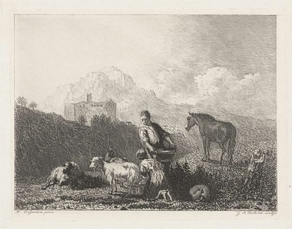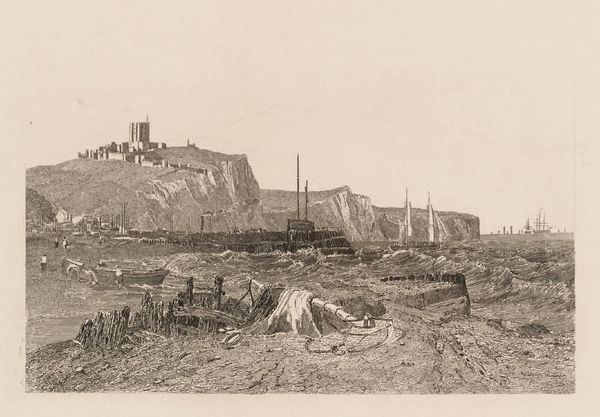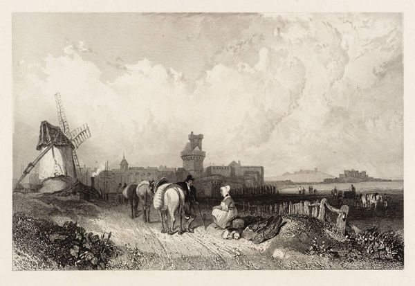 Curator: This is "Dieppe", an engraving by W.B. Cooke after a drawing by Clarkson Stanfield, who lived from 1793 to 1867. You can find it in the Tate Collections. Editor: It feels like a dream, a hazy memory. All those greys and browns, that old castle, make me think of stories from another time. Curator: Stanfield was celebrated for his maritime scenes, especially depictions of harbors and coastal life. The image of Dieppe serves as a historical record of the area. Editor: But it is a bit melancholy. Like the end of a long day. The workers, the heavy cart, even the castle seems to be fading into the landscape. Curator: Perhaps, but remember the context; Stanfield was catering to a market eager for picturesque views of Europe. It's a carefully constructed image, designed to evoke a sense of place and history. Editor: Maybe so, but I still sense that quiet beauty, that feeling of a place that's seen a lot of history. Curator: Indeed, and perhaps it's that blend of historical record and artistic license that makes Stanfield's work so enduring. Editor: Exactly. And for me, it's this atmospheric quality that draws me into its world.