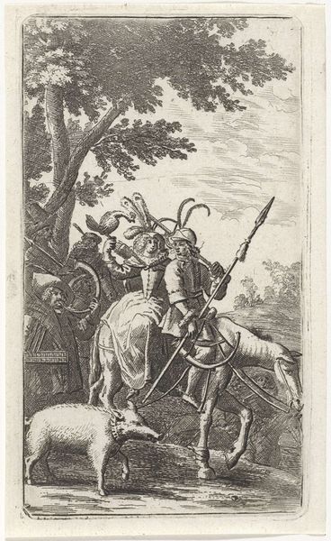Abraham de Bruyn created this engraving of a young German nobleman on horseback in the late 16th century. Immediately, the density of line work catches the eye, creating a rich, almost tactile texture across the entire surface. The artist meticulously details the intricate garments of the rider and the muscular form of the horse. De Bruyn employs a deliberate compositional structure where the horse and rider form a distinct vertical axis. This emphasis draws us into the subject, but it also engages with the broader semiotic language of status and power prevalent during the Renaissance. The lines, though static, convey movement, embodying the era’s fascination with portraying vitality and aristocratic bearing. Consider how the structural elements of this engraving extend beyond mere aesthetics. The careful detailing and formal arrangement underscore the values of hierarchy and spectacle inherent in courtly life. In scrutinizing these patterns, we begin to decode the cultural codes embedded within this historical representation.