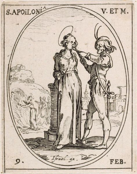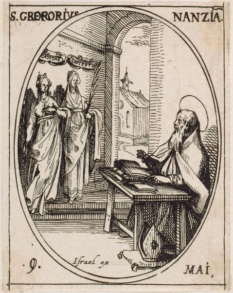 Editor: Here we have Jacques Callot's "Saint Norbert," a small engraving. The scene feels so precise, almost like a miniature stage. What do you see in this tiny drama? Curator: It's a world in a walnut shell, isn't it? Callot captures a moment of divine investiture, Saint Norbert receiving the habit from the Virgin Mary. The architectural setting gives it a sense of timelessness, but I'm also struck by the delicate lines. It feels so intimate and yet so grand. The artist wants us to imagine a deep connection between the characters. Editor: I love the way you put that. I kept thinking about the lines and the characters. It is so powerful!