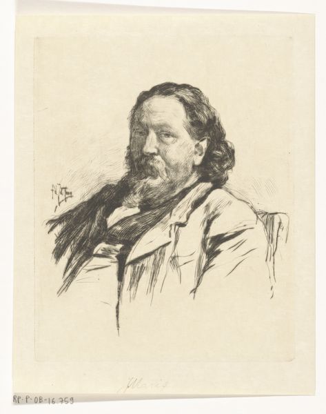 Editor: This is a portrait of Willem Maris, a pencil drawing created in 1893 by Jan Veth, currently housed in the Rijksmuseum. It feels like a blend of realism and caricature, with very deliberate line work. What's your take on this piece? Curator: Well, seen through a historical lens, this drawing operates on a few levels. Firstly, we need to understand the societal role of portraiture in the late 19th century. It wasn't just about likeness; it was about establishing social status, cementing legacies. Given it’s a drawing, though, and a somewhat unflattering one, it subverts this notion. Editor: Unflattering? Curator: Yes, think about it: Why choose to emphasize certain features with such bold lines? The exaggerated nose, the somewhat weary eyes. This wasn't just about documentation; it was about making a statement about Maris’s public persona, likely intended for circulation among a certain cultural circle. Caricature often served a specific political or social function. Was Maris a controversial figure? Editor: I'm not sure, I hadn't considered the political angle at all! I was more focused on the artistic skill involved. Curator: The skill is undeniable, but consider the institutions and power dynamics at play. Veth likely aimed for publication in a journal or broadsheet. Understanding where this image circulated, who its intended audience was, and what purpose it served gives it a much deeper meaning than just a portrait of a man with a pronounced nose. Ultimately, the drawing can be understood as commentary on the status of an artist in Dutch society at the end of the 19th Century. Editor: That's really insightful, a fresh way to view this. I’m walking away knowing way more about the nuances of art as social commentary!