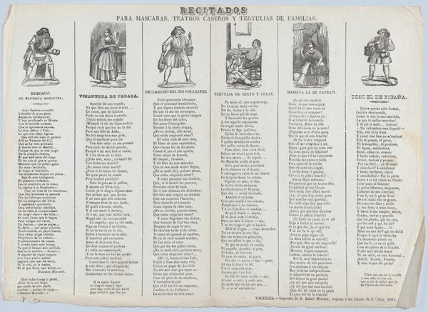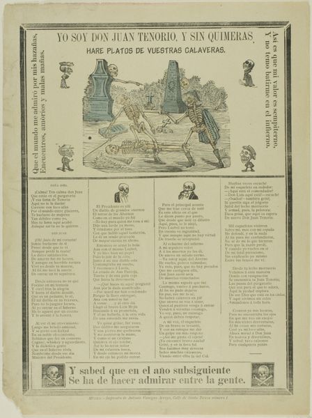 Editor: This is a 19th-century printed textile called "Handkerchief" by the Boston Chemical Printing Company. It's a fascinating piece; it presents as a visual narrative, with text surrounding different vignettes. I’m curious about its composition; the borders are quite ornate, yet the images themselves have a certain starkness. What do you see in this piece, especially considering it’s intended use as a common textile? Curator: Formally, I am drawn to the stark contrasts in texture and pattern. Notice the geometric border, its repetitive nature creating a frame for the emotionally charged scenes within. The figures, rendered with simple lines, lack the nuanced shading one might expect, emphasizing a flattened perspective, further amplified by the surrounding narrative text. The density of this text, in turn, produces a visual contrast against the airy, almost sparse figures and landscapes of the three sections. Do you perceive a purposeful effect from this juxtaposition? Editor: Yes, I do. It creates a dynamic tension. It’s like the artist is setting up these conflicting visual cues for a reason, right? The elaborate border contrasts with the scenes' relative simplicity, potentially highlighting the emotional complexity of the stories contained within. So what are they? Curator: These conflicting cues enhance, precisely, the semantic potential within the compositions, using framing techniques to heighten our attention. These compositional attributes enhance not only the surface’s two-dimensionality, but our ability to decode textual/narrative information from the represented figures. Consider the figures within the illustrated vignettes; do they convey qualities reflective of other images of its kind during the 19th Century? Editor: They feel somewhat simple, less detailed. What strikes me is how the overall composition leads you to visually read before noticing the image. It really does challenge our standard interpretations of visual hierarchy! It's a small textile, meant for wiping one’s face, elevated to storytelling device. Curator: Exactly! By considering elements such as form, space, line and narrative, our understanding has surpassed assumptions of surface beauty.
