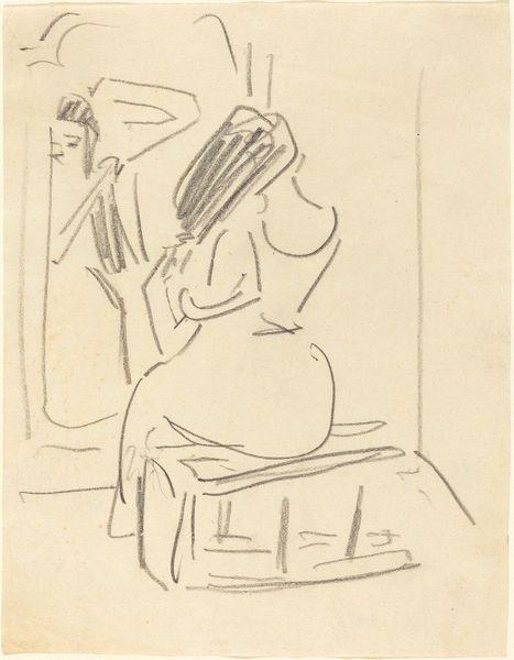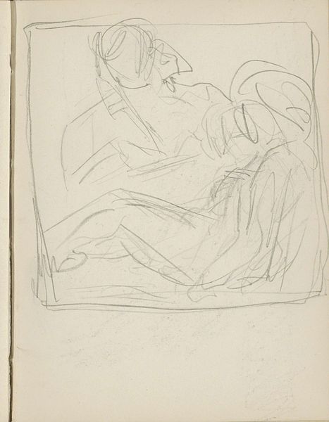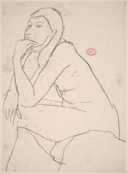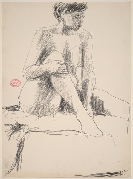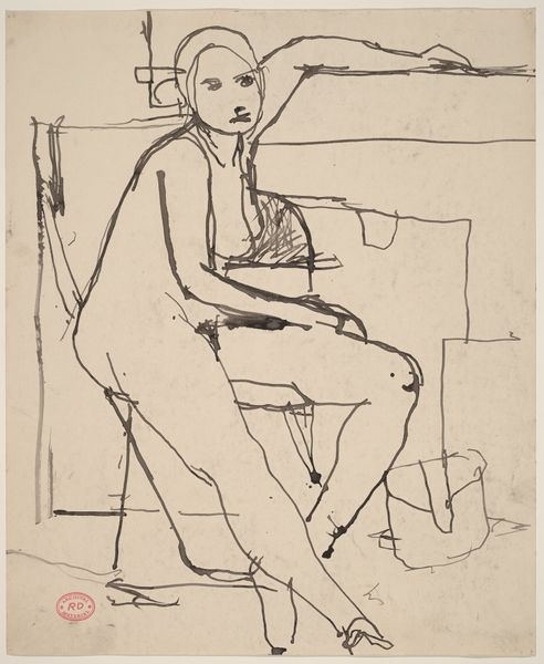 Curator: This is Franz Kline's "Woman Seated in Armchair," a drawing executed in ink on paper in 1946. It gives us an insight into his early figurative work before his signature large-scale abstractions. Editor: It’s striking how few lines can suggest such a burdened mood. The asymmetry, especially the heavy, dark strokes around the eye, amplifies that feeling. Curator: Indeed. Look at the date. 1946. Post-war America was grappling with massive social changes. Many women who had entered the workforce during the war were now expected to return to domestic roles. Do you think that perhaps the drawing portrays some of this tension? Editor: Perhaps. The sharp angles in the clothing conflict with the woman's otherwise soft, rounded form and with the round shape in the lower part of the drawing. This adds to the internal drama you speak of, regardless of its potential social implications. Her head is quite prominent. It gives this whole drawing an almost top-heavy feeling. Curator: That reminds me of the rise of Existentialism that also began around this time. There was so much discourse exploring personal anxiety, especially relating to what it means to exist. The rapid rise of psychoanalysis must have influenced Kline's work, whether consciously or subconsciously, with artists exploring subjectivity and the inner life. Editor: The scratchy, nervous lines evoke the angst and uncertainty you described. Consider how Kline is essentially presenting the interior of this woman via abstraction, how the line doesn't merely denote an outline, but describes inner tension. Curator: Absolutely. And consider the historical context of Kline exhibiting alongside figures such as Pollock and de Kooning; Abstract Expressionism was considered distinctly American. They created these supposedly universal visual languages. We see this interest even within his figuration. Editor: The formal relationship between the lines is undeniably what holds the viewer's eye. I concede there may be cultural contexts worth exploring to find additional meaning, but I cannot forget that Kline made conscious artistic decisions while making this drawing. The essence of its effect resides, primarily, there. Curator: It’s in the confluence, I believe—the artist and artwork within its era, within a framework that gave both life and meaning. Editor: Ultimately, it’s these converging interpretations that grant it continued resonance, a mirror reflecting both our personal and shared history.