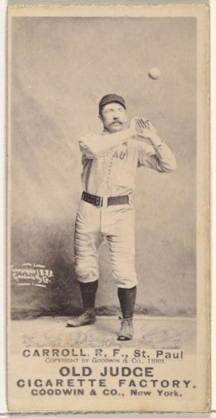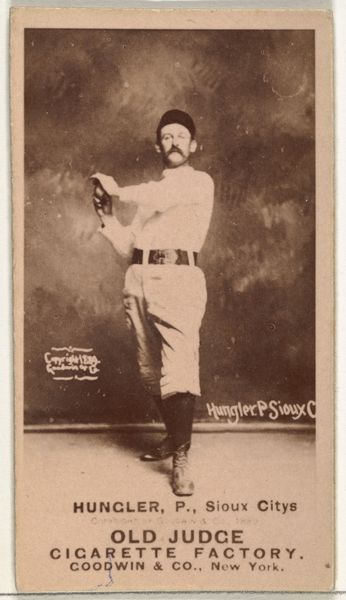 Goodwin & Company produced this photograph of Tyng, a Philadelphia pitcher, as part of the Old Judge Cigarettes series. The sepia tone of the image gives it a nostalgic feel, highlighting the texture and materiality of the baseball player's uniform against the backdrop of what seems to be an outdoor scene. The composition centers on Tyng, his figure diagonally positioned to draw the eye upwards from his boots to the ball held aloft in his hand. This creates a dynamic tension, a sense of movement frozen in time, further emphasized by his focused gaze. The photograph plays with notions of celebrity and commerce. The player’s image, captured with a clear intent to idealize, is both an advertisement and a collectible. This combination suggests the growing commercialization of sport at the time and prompts us to consider how such images construct and convey cultural values around athleticism and masculinity. Notice how the linear elements – the stripes on his cap, the belt around his waist – structure the visual field. These elements, while simple, contribute to the photograph’s underlying organization, transforming a portrait into a cultural artifact.