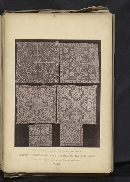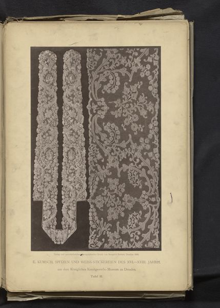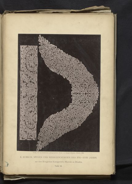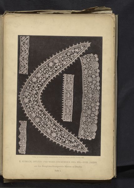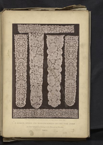 This monochromatic print showcases four pieces of 17th-century Venetian lace from the Kunstgewerbemuseum in Dresden. The composition arranges these delicate fragments against a dark backdrop, emphasizing their intricate patterns and varied textures. The stark contrast heightens the visual impact, drawing attention to the lace's complex interplay of voids and solids. The formal arrangement of the lace pieces speaks to a larger cultural dialogue about value and preservation. By isolating these examples, the artist invites us to consider the historical context and the labor-intensive craftsmanship involved in their creation. Each piece, with its unique design and subtle variations, represents a complex semiotic system of signs, reflecting the social status and aesthetic preferences of its time. The act of photographing and cataloging these textiles elevates them from mere functional objects to cultural artifacts, prompting ongoing interpretation and appreciation of their aesthetic and historical significance.