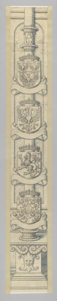 Curator: Here we have a watercolor drawing from the latter half of the 18th century, titled "The coat of arms of a female member of the Ockersse family, married to van Gelre and mother of Anna Digna van Gelre, with the coats of arms of her four grandparents." It’s attributed to an anonymous artist. Editor: Immediately, it speaks of lineage and the social structures of the time. These coats of arms, almost like curated biographies, remind us how identity was intrinsically linked to ancestry, particularly for women. Curator: Exactly. Looking closely, we can see the deliberate choice of watercolor, offering a delicate yet precise depiction. The careful rendering of each family crest points to the importance of heraldry during this period. Each element, from the stars to the stylized flowers, was meticulously designed. The Ockersse family, placed centrally, dominates the composition. Editor: But it is interesting to consider who commissioned it and why. Perhaps it served as a visual record intended to underscore social standing and marital alliances, a kind of painted family tree designed to be visually consumed and communicated, mostly for the male heirs. What’s the story *not* being told through these symbols of privilege? Curator: It makes you think about the artist as a craftsman rather than an individual genius; one might examine the labor that went into its production: the source and cost of pigments, the tools, and even the artistic training required. And of course, the broader political economy of Europe, the context in which status symbols are worth representing so laboriously. Editor: Indeed. These are powerful reminders that challenge conventional narratives, revealing how art served within a structured societal order to cement historical narratives of class and gender. Curator: Studying it, one could also look into the meaning and symbolism associated with heraldry at that time. What was considered valuable and what was omitted, by that single arm bearing an unfamiliar green vegetation, all must carry some unrecorded context. Editor: It really does prompt one to consider how inherited identities shape and, sometimes, confine women within dynastic ambitions and aristocratic narratives, and how we perceive these roles in contemporary discussions about the construction of social narratives and power. Curator: Looking at it with all these historical details does give a glimpse into the complex network of power dynamics that underpin this artwork. Editor: Absolutely; it's a valuable snapshot of how the social and cultural legacies intertwine, allowing us to connect historical analysis with ongoing discussions around power, gender, and identity in both past and present narratives.