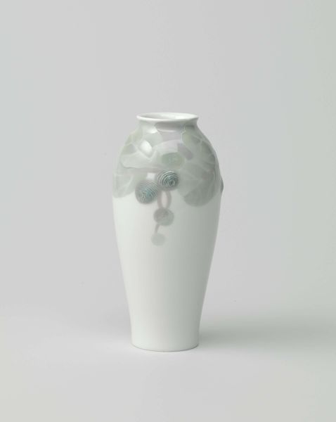 This porcelain vase is decorated in pâte-sur-pâte with leaves and flowers by Nils Erik Lundström. The delicacy of the porcelain medium speaks to a history deeply entwined with trade, cultural exchange, and the rise of industrial production. Consider the cultural context in which Lundström created this vase. What does it mean to adorn a vase with flowers? Perhaps it's a longing for nature amidst urbanization, or maybe it's about the feminized space of the domestic sphere. The pastel palette, the delicate rendering of flora – these elements speak to deeply ingrained societal associations with femininity and fragility. Lundström subverts tradition by using pâte-sur-pâte decoration; he invites us to consider how traditional forms are not static, but constantly evolving in response to the present. He offers a space to reflect on the intersection of art, nature, and gender.