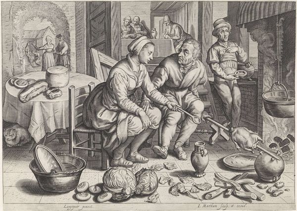 Editor: We are looking at Peter Wtewael's "Kitchen Scene," painted in the 1620s. It's an oil on panel piece. There is an intense physicality to the food that is quite striking, an honest and immediate presentation. What aspects of its composition and use of materials stand out to you? Curator: Observe how Wtewael meticulously renders each object and figure, primarily emphasizing their tactile qualities and arrangements within the space. Consider the interplay of light and shadow and how it defines form, giving a clear structure. Are you not struck by how the arrangement of elements, the interplay of light, shadow and form contribute to a stable compositional equilibrium? Editor: Yes, absolutely. The way the light catches the different textures – the feathers, the metal, the skin of the meat – it’s almost photographic in its detail. The painter is not avoiding representing material reality; he is seeking it out. It is compelling. What does that focus on materiality convey? Curator: The artist's rendering of these commonplace objects celebrates the inherent aesthetic properties present in daily existence. What Wtewael constructs within the frame, and not its representational aspect, constitutes its value. How might one discuss the emotional content in that respect? Editor: I see. It's not about a story; it is more about shapes, colors, textures and composition that make it fascinating. Curator: Precisely. Form is prioritized over narrative, guiding the viewer’s gaze through a calculated choreography of lines, colors, and shapes. The emotional and intellectual elements emerge solely from such structural qualities. Editor: This way of seeing it definitely encourages one to look more closely at the details! I never considered interpreting paintings this way, purely through form and material reality rather than historical content or interpretation. Curator: Indeed. Recognizing the painting’s intrinsic attributes heightens our appreciation. This close study lets us appreciate not only what is depicted but how it’s rendered.