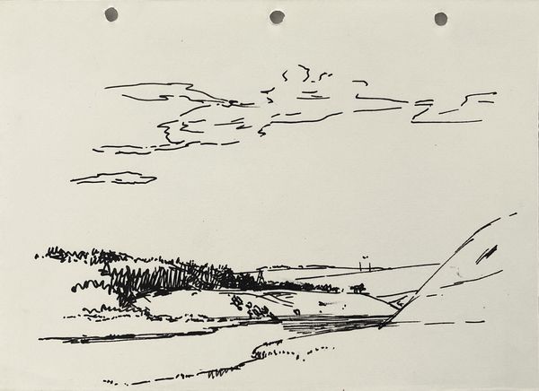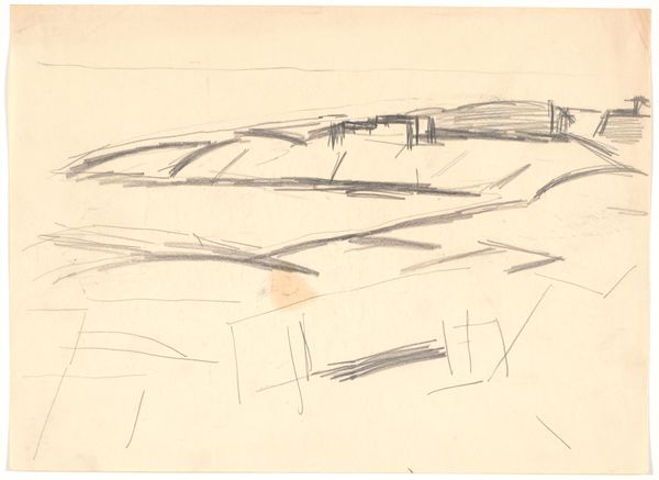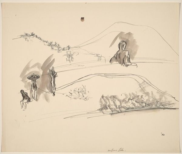 Curator: Elaine de Kooning's 1974 work, "Etampes", executed with ink and watercolor, invites us to explore the artist's landscape-inspired abstraction. Editor: My first impression is a subdued, almost melancholic landscape. The restricted palette and delicate washes give it a feeling of transience. It feels both serene and unsettling. Curator: It’s interesting you say that, because De Kooning's work has always navigated this boundary between personal expression and the objective world. "Etampes" appears at first to be a typical landscape, yet on closer examination, it dissolves into abstract forms. It’s from a period when she traveled widely; this engagement is crucial for interpreting how she visually negotiates and records different landscapes and cultures. Editor: Absolutely, I think that transience is particularly pertinent in examining post-war trauma as it manifested for women who were forced to create their place within masculinist art world environments and gendered expectations more broadly. De Kooning's method of layering and obscuring recalls psychological concealment during periods of change. The location “Etampes” seems geographically irrelevant next to her visual representation of memory. It creates space for broader feelings about existing at a time and a place, without ever fully becoming of it. Curator: The gestural quality, of course, is tied to the action painting movement, emphasizing the physical act of creation. These blurred lines suggest an attempt to grasp a moment. Looking at it now, one could consider her rapid brushstrokes a proto-feminist expression; an exploration of the ephemeral experience, that so many women share as time-bound, undervalued citizens. Editor: Yes, and this perspective enhances how we examine abstraction itself. I would push back against associating all "action" with proto-feminism simply because it involves female authorship; her abstractions still must contend with her particular choices and place within social dynamics. Instead, thinking about how de Kooning negotiated space using form, ink, and line; that to me has profound political dimensions. Curator: An interesting perspective! It forces us to consider whose perspective dictates value judgments, historically, institutionally and aesthetically. Editor: It suggests that by interrogating aesthetic "value" alongside broader feminist objectives, there will be more justice in art and other arenas.