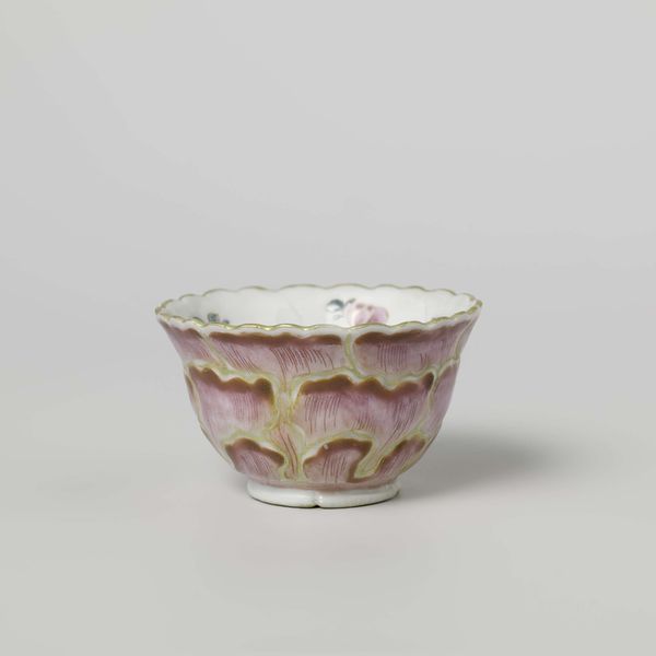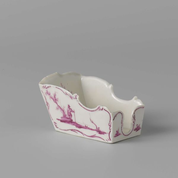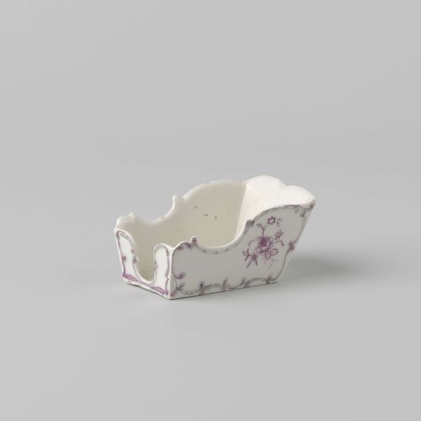 Editor: So, here we have a pair of porcelain salt cellars made by Loosdrecht, circa 1774-1778. They’re currently held in the Rijksmuseum. The delicate purple landscape scene seems quite quaint and decorative. What’s your take on these pieces? Curator: Well, first, consider the cultural role of salt during this period. Before refrigeration, salt was vital for preserving food. Having elaborate salt cellars wasn’t just about utility; it signaled wealth and social standing. How does this knowledge shift your perspective on their decorative quality? Editor: I see, they weren’t just pretty things, but functional objects that also performed a social function. So, the artistry enhances their perceived value, reflecting the owner's status? Curator: Precisely! And let’s consider the Rococo style – the curving lines, delicate forms. These are designed to please the eye, to evoke a sense of luxury and refinement. This piece highlights a key shift of how the wealthy presented themselves. Editor: So it's a carefully constructed image they're projecting? Not necessarily honest but performative. Curator: Exactly. These cellars participated in that performance. The choice of porcelain too is telling. Porcelain production was a carefully guarded secret for a long time. Its adoption signaled a specific aspiration. Now does this deeper dive affect how you view them? Editor: It makes me realize I initially underestimated the craftsmanship. These pieces really say so much about the culture of consumption at the time, and also speak about access and social structures of the time. Thank you! Curator: Indeed. Looking closer, beyond aesthetic appreciation, reveals their fascinating place within a broader history. A truly eye-opening consideration, wouldn't you agree?