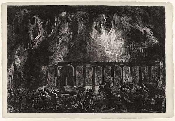 Giovanni Battista Piranesi made this etching, sometime in the 18th century, using an iron or copper plate. The image is achieved through the skilled application of acids, leaving behind incised lines that hold ink. Piranesi was a master of this demanding process, which allowed him to create dramatic compositions that are both awe-inspiring and terrifying. Note the architectural details. The ruins in this image have a remarkable amount of specificity, meticulously rendered through hatching, cross-hatching, and careful control of the etching process. This gives them an almost tactile quality. Consider how the act of creating multiple, identical impressions democratizes the image, and reflects the rise of print culture during this period. It's a departure from unique artistic creations, and speaks to a new era of reproducibility. This method of working allowed Piranesi's vision to circulate widely. In doing so, he blurred the lines between artistic creation and industrial production. By focusing on the materiality and social context, we gain a richer understanding of the artist's intent, and the broader cultural landscape of the time.