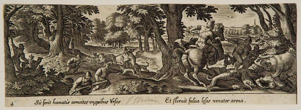 Curator: Here we have "Stag Hunt with Spears," a print from the workshop of Philips Galle. The linear quality, the details...it's just stunning. Editor: It reminds me of a fever dream, all this frantic energy. Look at the sheer activity, the hunters, the dogs, the deer... a chaotic symphony of pursuit. Curator: Galle and his workshop were prolific printmakers. This piece likely circulated widely, spreading images of aristocratic pastimes and solidifying social hierarchies. Editor: It makes me think about the labor involved, the engravers carefully etching these lines, reproducing this scene for mass consumption. Curator: Exactly, and it brings attention to the political power of image-making. It’s fascinating to consider how images like this both reflected and reinforced systems of power. Editor: I see it less analytically, more as a captured moment in time. Raw, visceral, a memento mori of the hunt. It’s beautiful and terrible all at once.