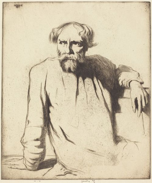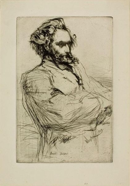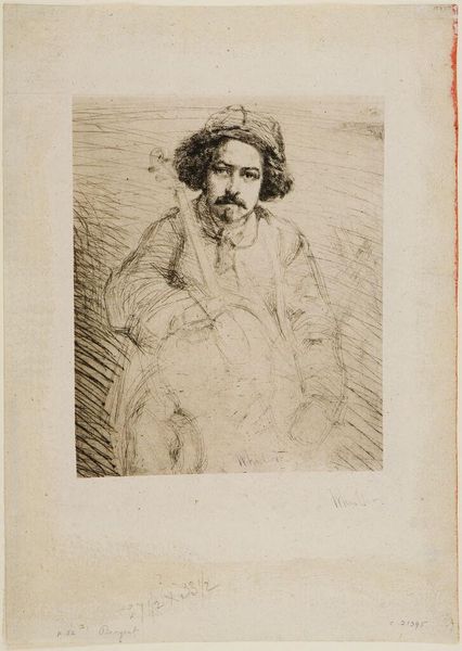 Curator: Whistler's etching, "J. Becquet, Sculptor," presents us with a portrait of an artist and his instrument—or perhaps his muse. There's a sketch-like quality to it. Editor: I'm immediately struck by the intimacy, despite the sitter's formal pose. The lines feel very raw, as if we're catching a glimpse of Becquet in a private moment. Curator: The work exists within a larger context of 19th-century artists representing their peers. How do we interpret this depiction of artistic labor and identity? Does Whistler, in his choices, comment on the role of the sculptor in society? Editor: I think we must consider the performative aspect of artistic representation. Whistler wasn't just documenting Becquet; he was constructing an image of the artist as a thoughtful and creative individual. Curator: Absolutely, and thinking about the relationship between the artist and his subject helps us question the artistic intentions of the piece. Editor: Examining art through this lens reveals the power dynamics inherent in representation. Curator: Indeed, it broadens our understanding of the artwork's social dimensions. Editor: It's made me see how intertwined art, identity, and social context truly are. Curator: Yes, viewing the work in this manner adds depth to an otherwise formal representation.
