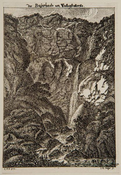 Editor: So, this is Johann Christian Reinhart's "A Civita Castellana." It feels almost like a stage set. What draws your eye when you look at this work? Curator: I’m struck by the contrast between the meticulous detail of the etching and the raw, unidealized portrayal of the landscape. It highlights the labor involved in its making. Editor: That's interesting! I was so focused on the natural scene. Curator: Consider also how this print would have been circulated. Whose hands did it pass through? The paper itself, the ink… they each have a story to tell about production and consumption. Editor: I hadn't thought about it that way. Thanks! Curator: My pleasure! Now I'm seeing it with fresh eyes too!