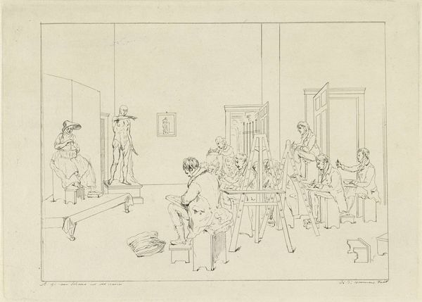 Curator: I see such intimacy and implied narrative—it feels like peering through a keyhole into someone's life. The lightness of the pencil work lends a sense of fleeting, captured moments, wouldn't you agree? Editor: Indeed. What we're looking at is an intriguing work titled "Interior Scene," crafted anonymously sometime between 1800 and 1900. The piece is an ink and pencil drawing, currently held at the Metropolitan Museum of Art. It really invites inquiry into the modes of living at the time and invites us to question who gets to define the value of craft? Curator: The arrangement of figures is captivating. A woman playing the piano, a man approaching a chaise lounge, while another relaxes. The woman tending the bed almost gives me a voyeuristic experience; as if time itself has ceased within those walls. Notice the casual inclusion of what looks like a fallen bottle, the rumpled bedding... the artist certainly invites us to engage with a candid depiction. Editor: What strikes me most, seeing the loose rendering and unfinished quality, is how this would have been produced as practice or pedagogical. If you notice the quick hatching on the ground and wall spaces, you get a glimpse of a technique that moves between high-art figuration, in some places, and the craft of interior decoration in others. There is also something very modern about seeing these interior markers of middle class domesticity at a moment where the romantic style starts questioning such class distinctions. Curator: A keen observation about the styles that blend! And you're right to call attention to that duality; as the lines between public and private spheres blurred during the romantic era. Editor: Overall, it seems such an intimate glimpse into a past reality mediated through romantic sensibility. I'm also left with an unexpected appreciation for anonymity and how its disruption of artistic legacies lets the mind of the spectator roam free! Curator: I love that thought and the space that it offers for imagining! Well, there you have it. Editor: Until our next art encounter!